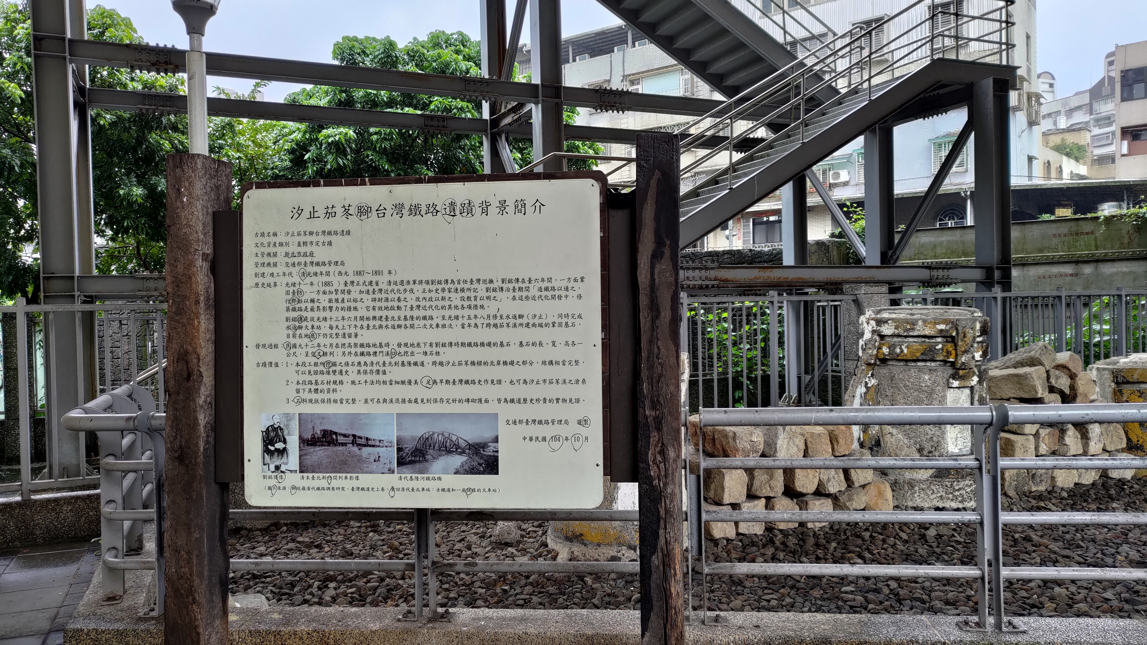汐止火車站不只是重要的交通樞紐,從歷史層面來看,它也是台灣鐵路車站中歷史最悠久的車站之一,我走訪了位於高架鐵路之下的“汐止茄苳腳臺灣鐵路遺蹟”,雖然如此,但它地處偏僻,只有偶爾經過的路人,連我在這次田野調查之前都未曾駐足過,那是自清代留傳下來的鐵路石料的遺蹟,是民國92年開挖高架鐵路時意外發現的劉銘傳時期橋礎的基石,但其實就是簡簡單單的石料跟圍欄而已,一旁還有一個告示牌這樣寫著: