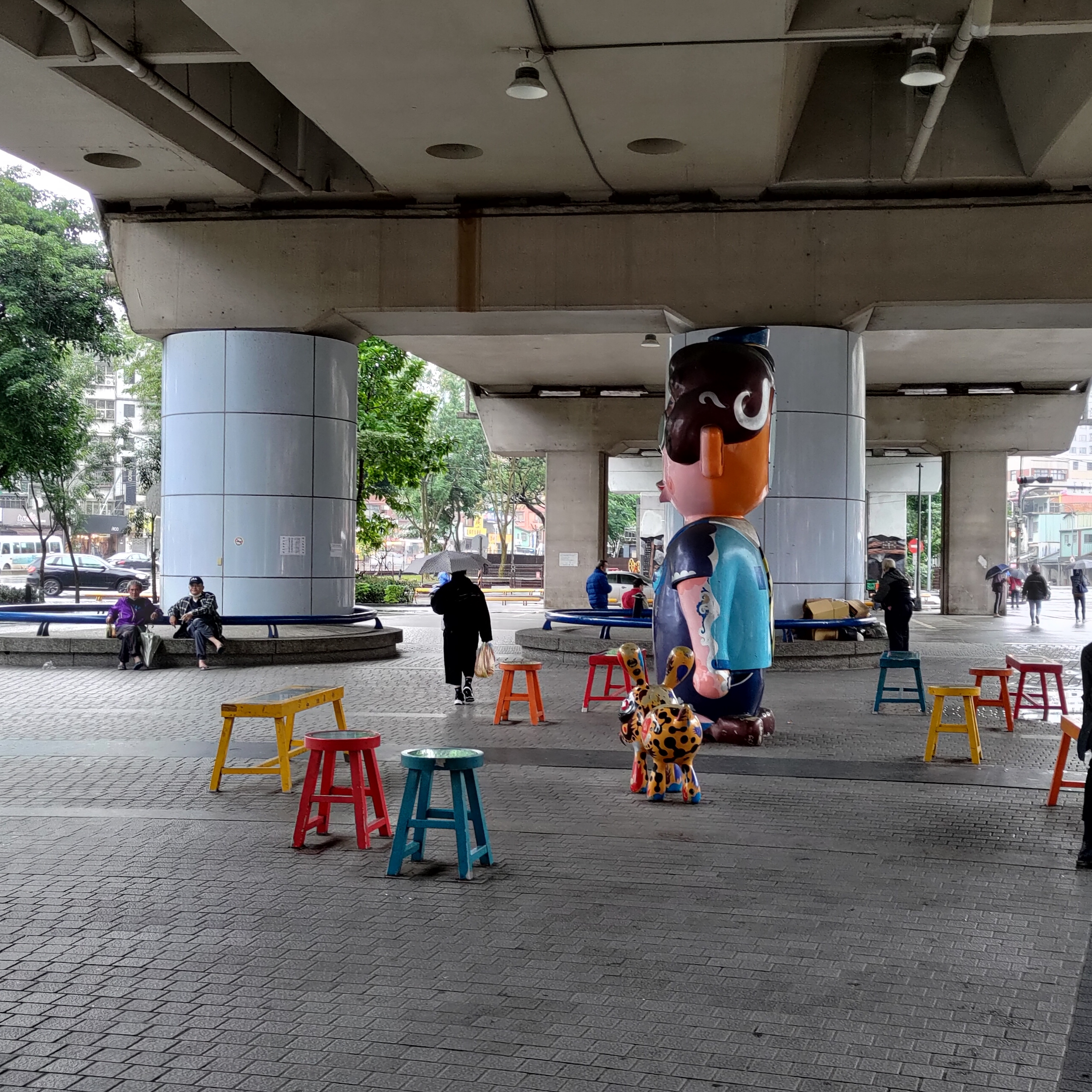 實際走往月台的路上會看見兩種截然不同的風景,火車站有前後兩個出口。但其實前後站是舊稱,從前站出去,也就是現在的東出口,左邊是大同路,右邊是汐科路,眼前第一時間看到的是一個特別的大型裝置藝術,其實我對它也是困惑非常久了,訪問了一些過路人卻也沒有人對他有所了解,根據網路上的資料,那是藝術家洪易的作品,雙面的人,一面是上班的站長 ,另一面是迎接先生下班的太太,旁邊還有一隻小狗。特別的是,站長的臉是一個時鐘的模樣,連供人休憩的各種椅子都是時鐘的設計,就像是車站每天日夜路過的每個繁忙的旅人緊湊的生活步調,充滿巧思的設計為東出口廣場添了一番風味,如果能在一旁加上說明和介紹的告示就更好了。