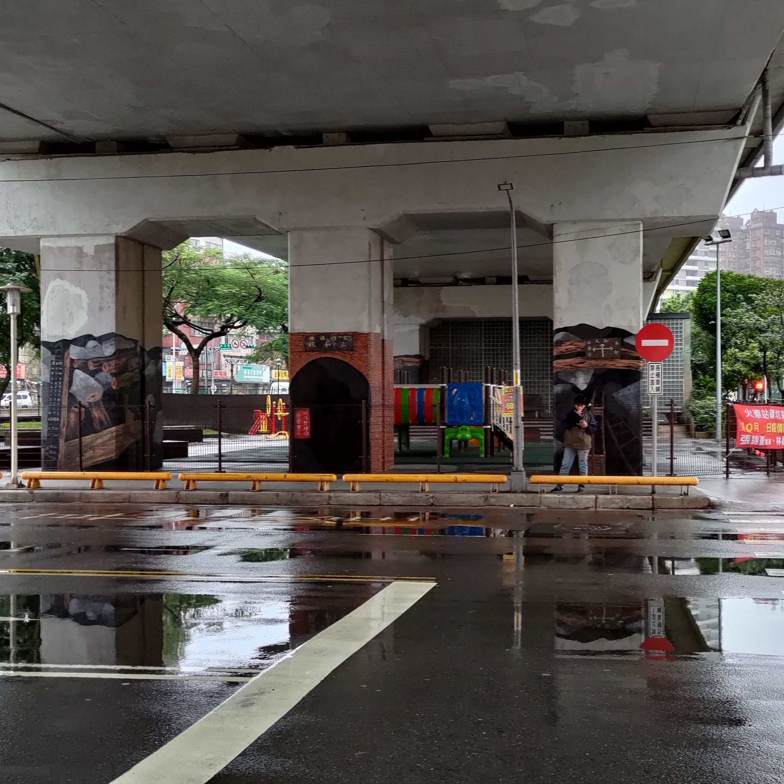 東出口的廣場一直是熱鬧的地方,從清晨時老人們的太極和法輪功,早上通勤的上班族、學生和為之服務的早餐店,中午下午群聚下棋聊天的爺爺奶奶們,到晚上的衣服、襪子、髮飾甚至水果的攤販(這似乎是違法的,我常常看到警察來驅趕這邊的攤販,最近警察更常來了),在一些特別的時候,這裡還能看到附近國小的社團成果發表會和老人們的社區聯歡晚會。跨越信義路的鐵路高架橋下還有一個剛落成不久的兒童遊樂場,雖然我造訪的幾次都沒有太多的孩子和家長在,但上頭的圖畫和鐵路礦坑有關,很是有趣。